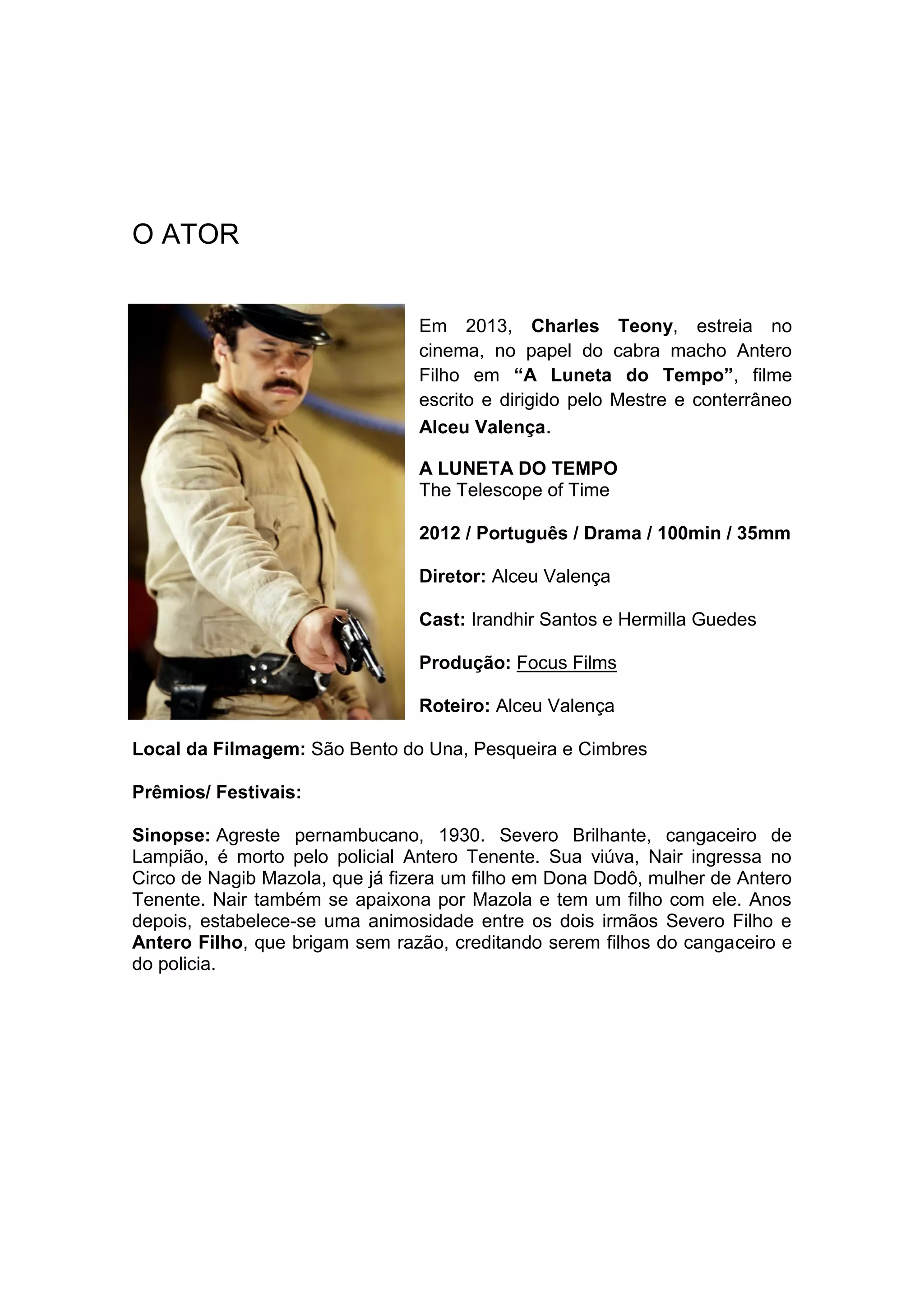 O documento descreve o filme "A Luneta do Tempo" de 2012, dirigido por Alceu Valença. O ator Charles Teony estreou no cinema interpretando o papel de Antero Filho neste filme, que se passa no agreste pernambucano de 1930 e conta a história de rivalidade entre os irmãos Severo Filho e Antero Filho, filhos de um cangaceiro e de um policial, respectivamente.