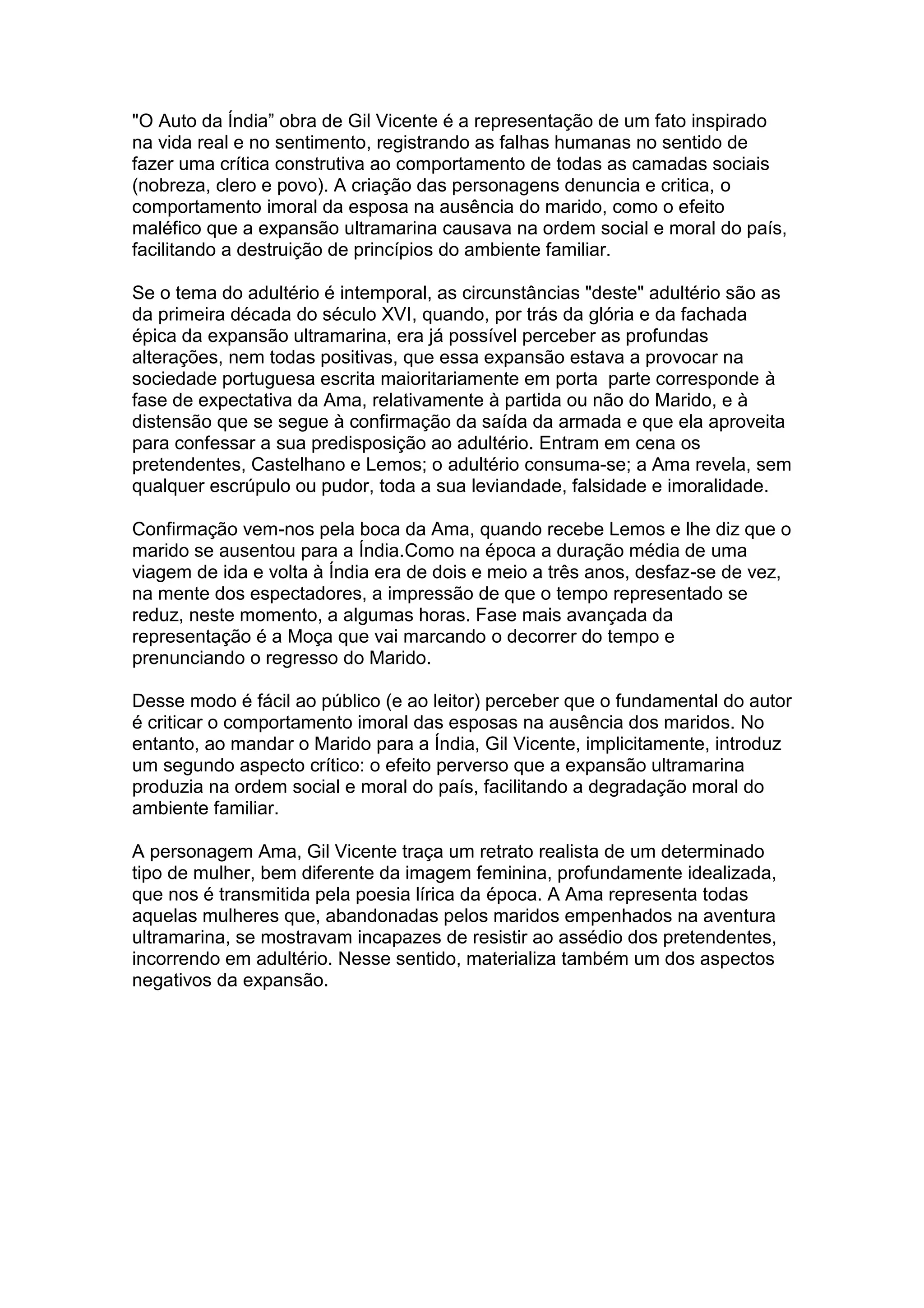 O documento analisa a obra "O Auto da Índia" de Gil Vicente, que critica o comportamento imoral das esposas na ausência dos maridos durante a expansão portuguesa para a Índia no século XVI. A peça representa uma esposa, Ama, que comete adultério enquanto o marido está na Índia, mostrando os efeitos negativos da expansão ultramarina na ordem social e moral de Portugal. A obra fornece uma crítica construtiva da nobreza, clero e povo e traça um re