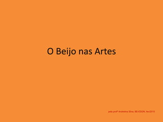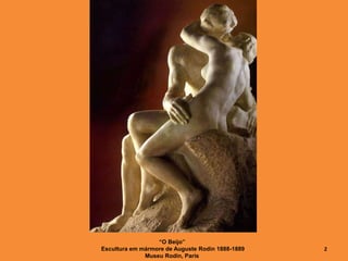 O documento explora representações do beijo nas artes, apresentando diversas esculturas e pinturas de renomados artistas como Rodin, Brancusi e Waldmüller. Também menciona ícones do cinema e os famosos beijos em filmes como 'Titanic' e 'Romeu e Julieta'. Aprofunda a análise sobre como o beijo é simbolizado e interpretado em diferentes contextos artísticos e culturais.
