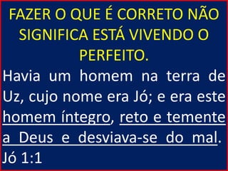 O documento discute a história bíblica de Jó e como sua experiência com Deus, apesar de muito sofrimento, o levou a uma compreensão maior. Três pontos principais são: 1) Jó era um homem íntegro que sofreu grandes perdas; 2) Sua esposa o encorajou a amaldiçoar Deus, mas Jó manteve sua fé; 3) No final, Deus restaurou tudo o que Jó tinha perdido e mais, levando-o a uma compreensão maior do plano de Deus.