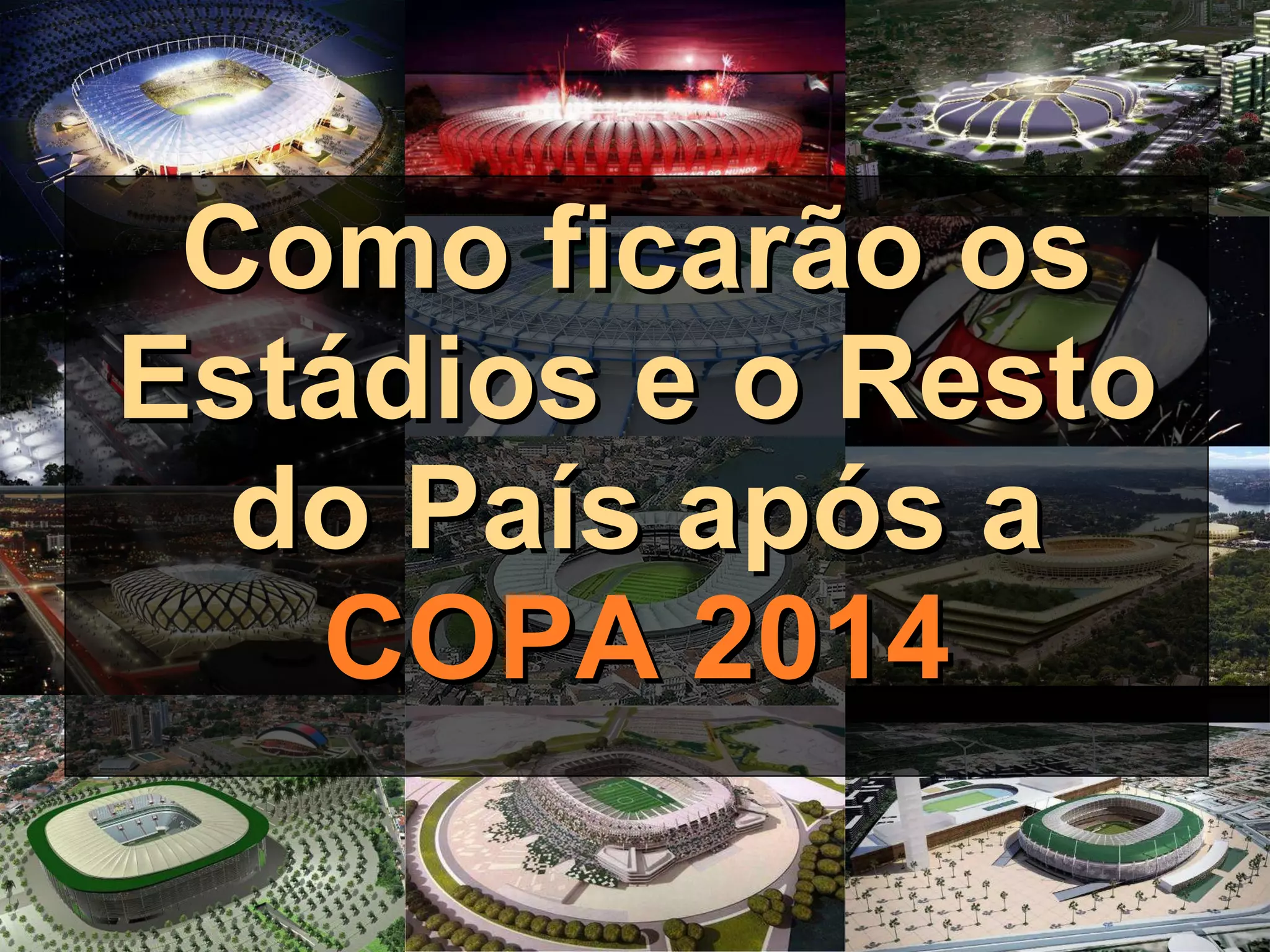 O documento descreve projetos de reforma e construção de estádios para a Copa do 2014 no Brasil, com detalhes sobre arquitetos, capacidades e valores. No final questiona como ficarão escolas e hospitais com os grandes investimentos em estádios.