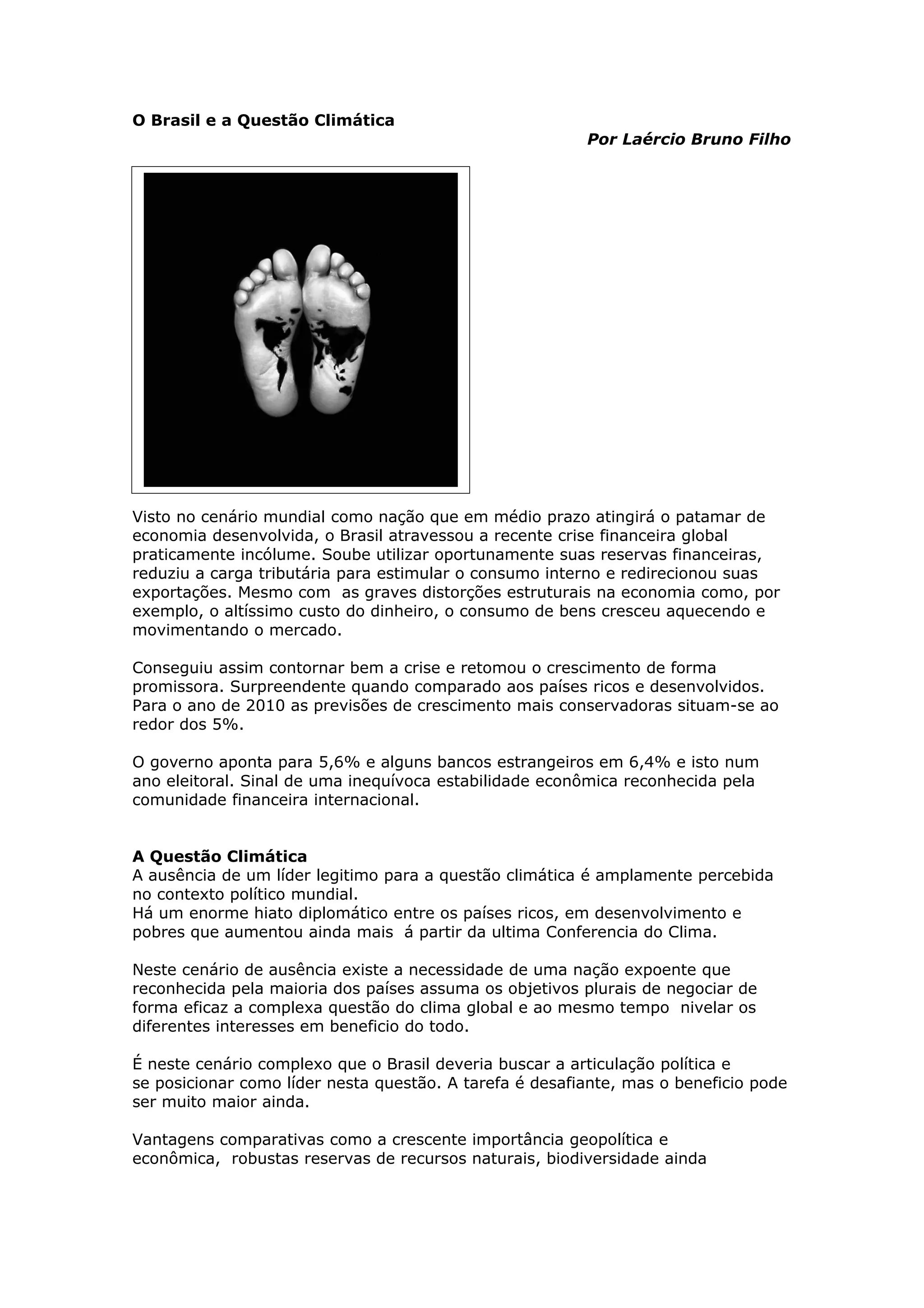 O documento discute o Brasil assumir uma posição de liderança na questão climática global, devido às suas vantagens como economia em desenvolvimento com recursos naturais preservados e metas ambiciosas de redução de emissões. Também aborda a necessidade de discutir padrões de consumo insustentáveis e como garantir padrões de vida satisfatórios no futuro diante dos impactos das mudanças climáticas.