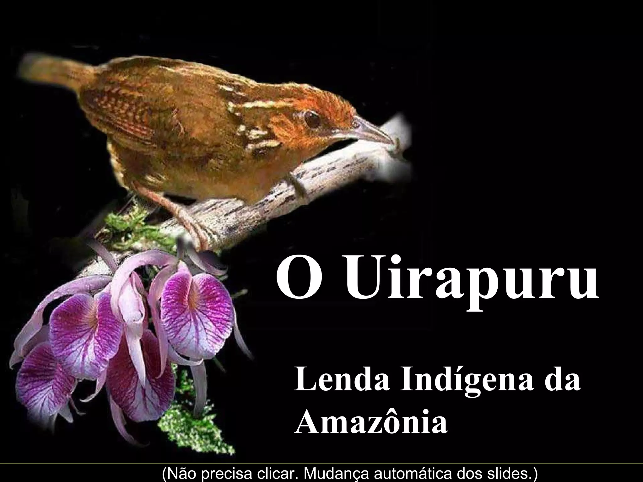 A lenda indígena conta que um belo índio foi transformado em um pássaro após sua morte, o Uirapuru, cujo canto encanta a floresta amazônica e inspira lendas sobre seu poder mágico.