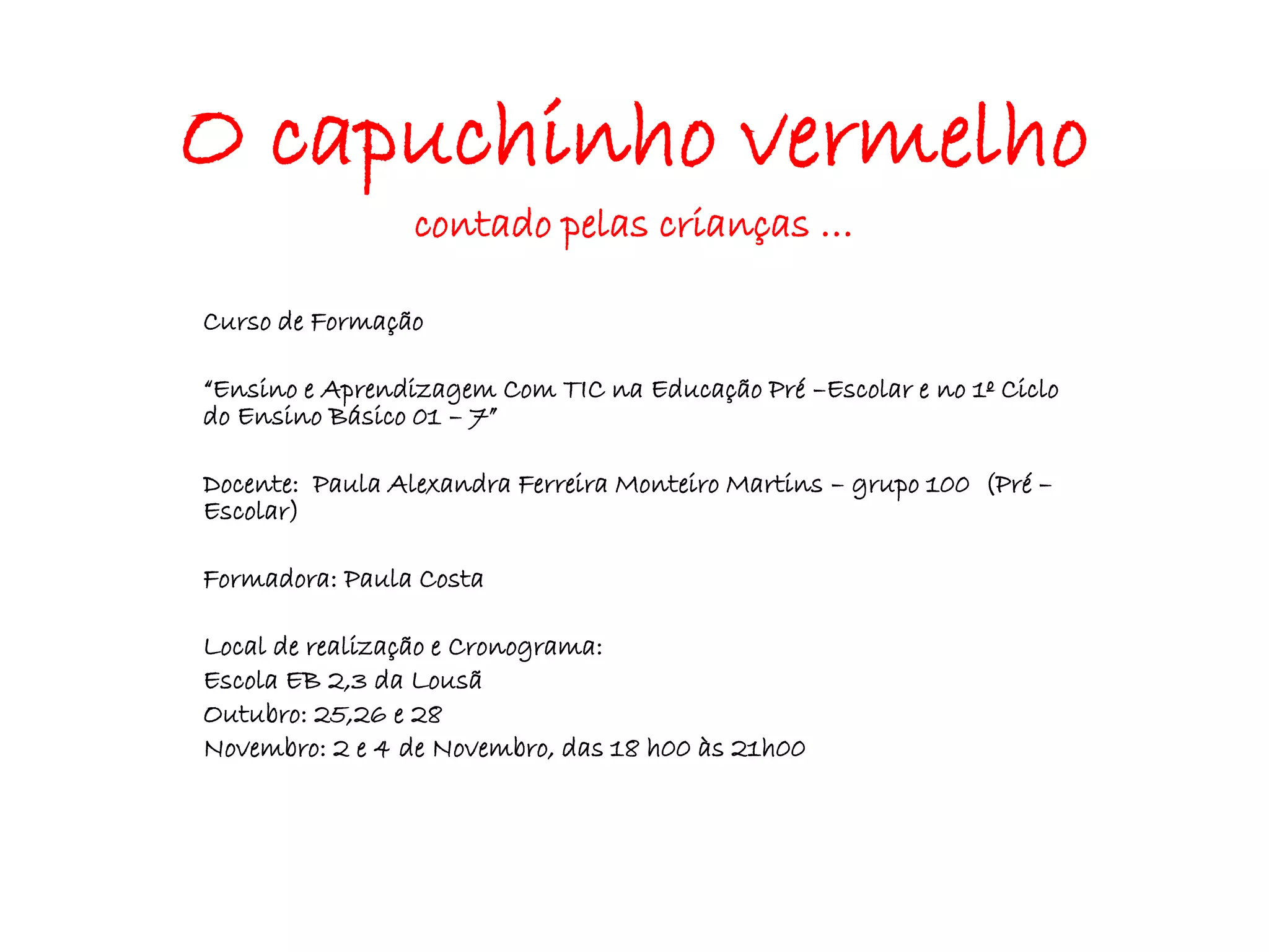 A história conta que a Capuchinho Vermelho levou bolos para a avó, mas encontrou o lobo mau no caminho. O lobo enganou a Capuchinho Vermelho e chegou primeiro à casa da avó, escondendo-a no armário. Quando a Capuchinho Vermelho chegou, o lobo fingiu ser a avó até comê-la. Um caçador ouviu o lobo e salvou tanto a avó como a Capuchinho Vermelho, enchendo depois o lobo de pedras. No final, todos ficaram felizes.