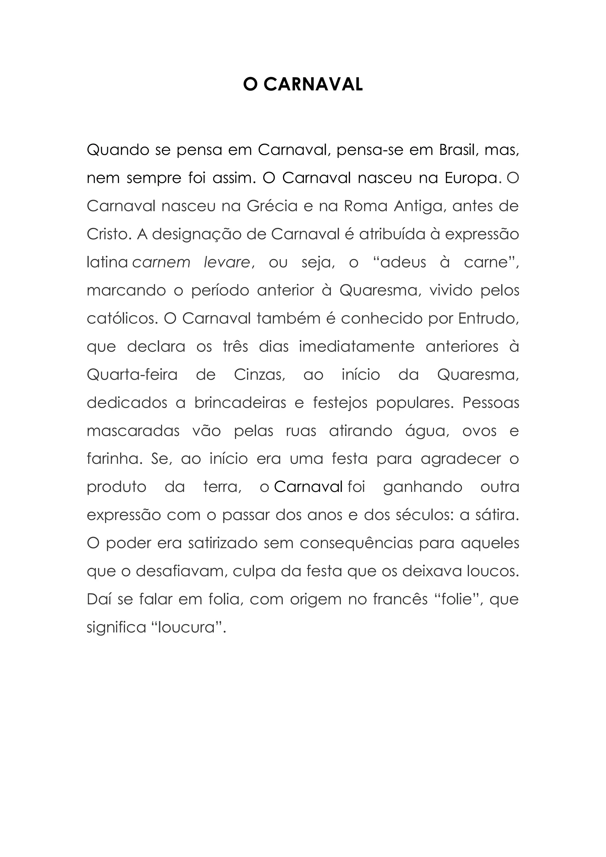 O documento descreve as tradições carnavalescas em diversos países, incluindo o Brasil. Menciona que o Carnaval teve origem na Grécia e Roma antigas e era uma festa para marcar o período antes da Quaresma. Descreve detalhadamente as tradições de Carnaval em países como Portugal, Itália, Bélgica, Dinamarca, Rússia, França, Países Baixos, Alemanha, Espanha, Croácia, Inglaterra, Eslovênia e Suíça.