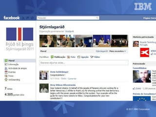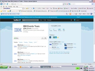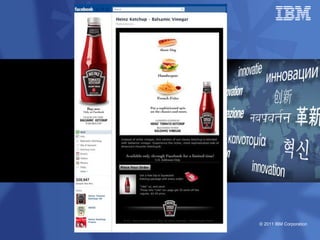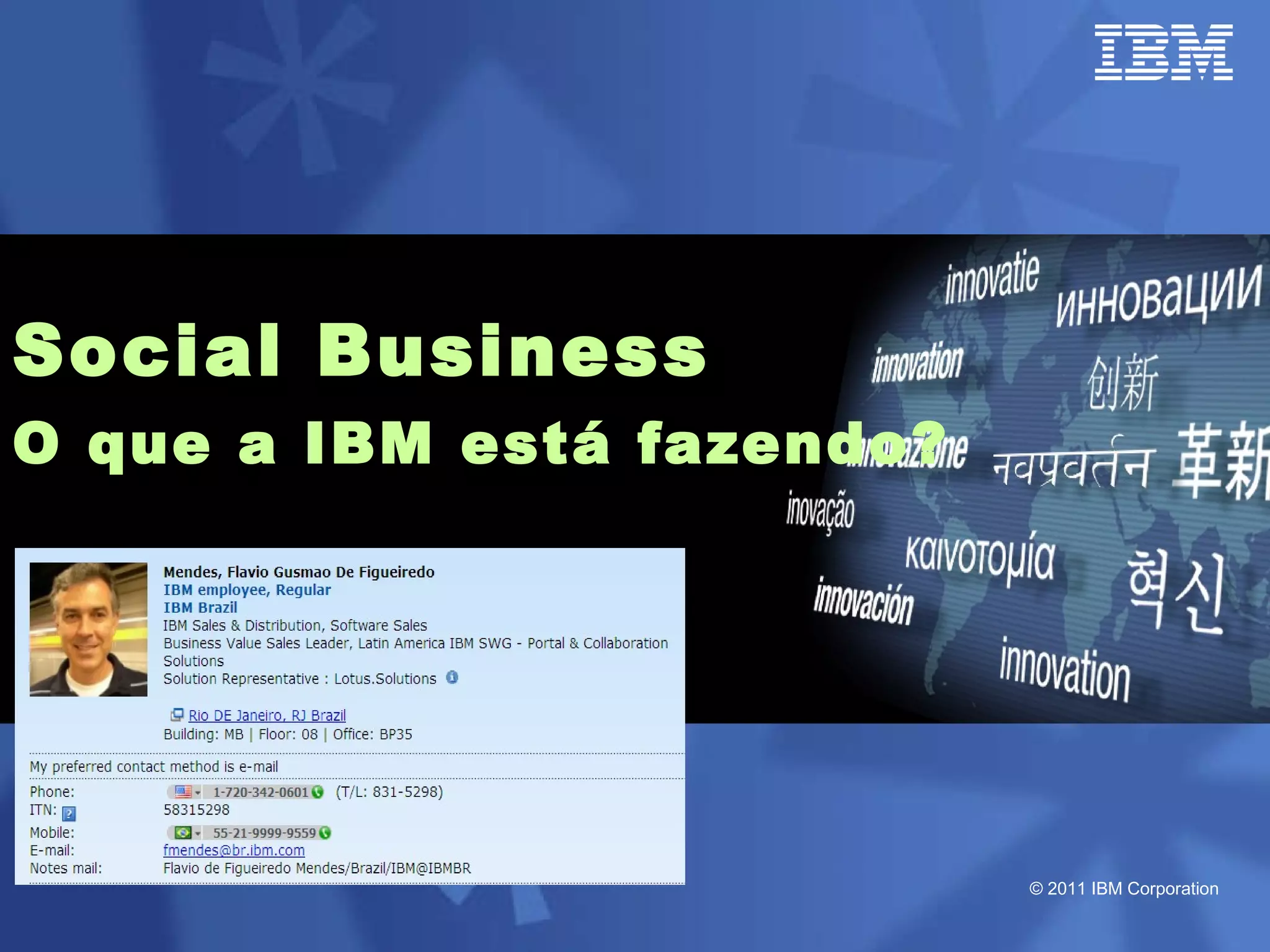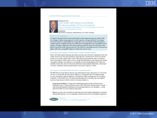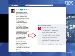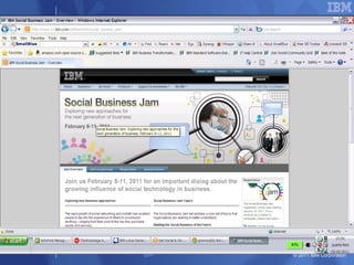 O documento discute as estratégias e iniciativas da IBM para social business, incluindo redes sociais internas como My developerWorks e InnovationJam para promover a colaboração, compartilhamento de conhecimento e inovação entre funcionários, clientes e parceiros. A IBM monitora métricas como volume de conversação, engajamento e distribuição de conteúdo para medir o impacto dessas iniciativas sociais nos objetivos de negócio.