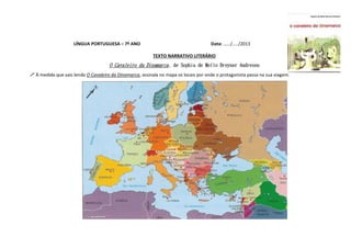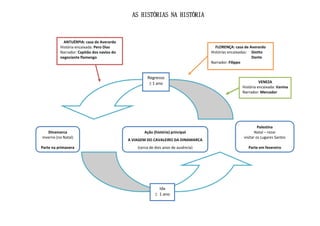 O texto descreve a estrutura narrativa complexa do conto "O Cavaleiro da Dinamarca" de Sophia de Mello Breyner Andresen. Contém várias histórias dentro da história principal sobre a viagem do cavaleiro da Dinamarca, que passa por locais como Antuérpia, Florença e Veneza, ouvindo histórias nesses lugares.