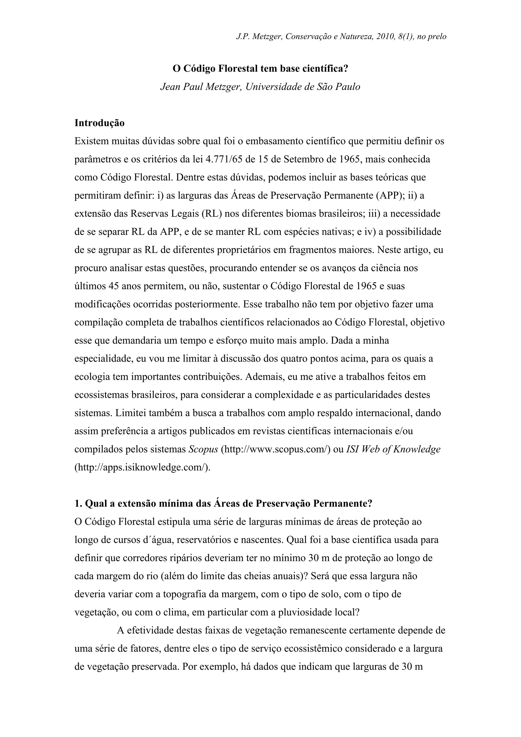 1) O artigo analisa se o Código Florestal brasileiro de 1965 tem base científica para definir os parâmetros de Áreas de Preservação Permanente e Reservas Legais.