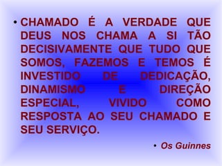 CHAMADO É AVERDADE QUE DEUS NOS CHAMA A SI TÃO DECISIVAMENTE QUE TUDO QUE SOMOS, FAZEMOS E TEMOS É INVESTIDO DE DEDICAÇÃO, DINAMISMO E DIREÇÃO ESPECIAL, VIVIDO COMO RESPOSTA AO SEU CHAMADO E SEU SERVIÇO. Os Guinnes