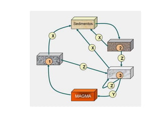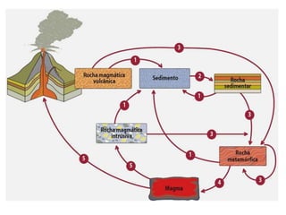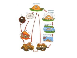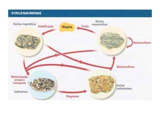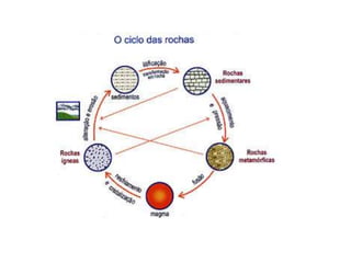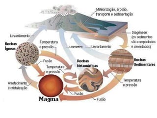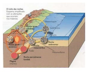 O documento descreve o ciclo das rochas através de três etapas: 1) formação de rochas sedimentares e metamórficas a partir do processo de erosão e sedimentação de outras rochas, 2) transformação de rochas em rochas metamórficas através de metamorfismo, 3) fusão de rochas formando magma e subsequente arrefecimento em novas rochas magmáticas.