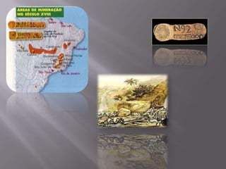 O documento descreve o ciclo do ouro no Brasil colonial, desde o surgimento das primeiras minas de ouro em Goiás, Cuiabá e Minas Gerais no final do século XVII, atraindo milhares de pessoas em busca de riqueza, até as mudanças econômicas e sociais trazidas pela mineração, como o desenvolvimento de cidades e a urbanização.