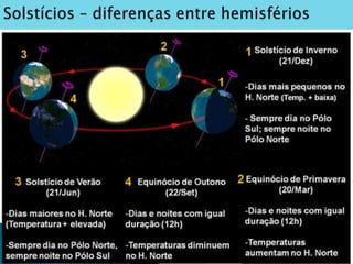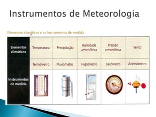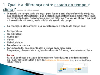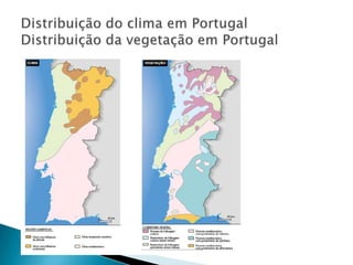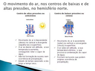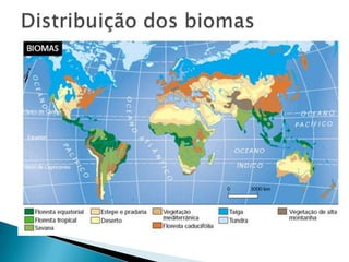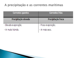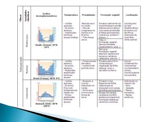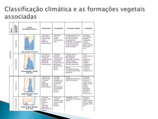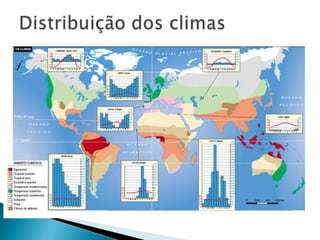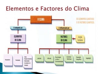 Este documento descreve os principais elementos climáticos e como eles variam no tempo e espaço, influenciando as formações vegetais. Discutem-se os efeitos da latitude, altitude, proximidade do mar e correntes marítimas sobre a temperatura e precipitação. Também se explica como a inclinação dos raios solares, o movimento de rotação e translação da Terra afetam as variações diárias, sazonais e anuais da temperatura.