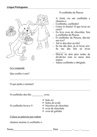 A menina Anita viu um coelhinho e o chamou. O coelhinho disse que era o coelhinho da Páscoa e levava ovos de chocolate no seu cesto. A menina pediu um ovo e o coelhinho deu-lhe dois ovos.
