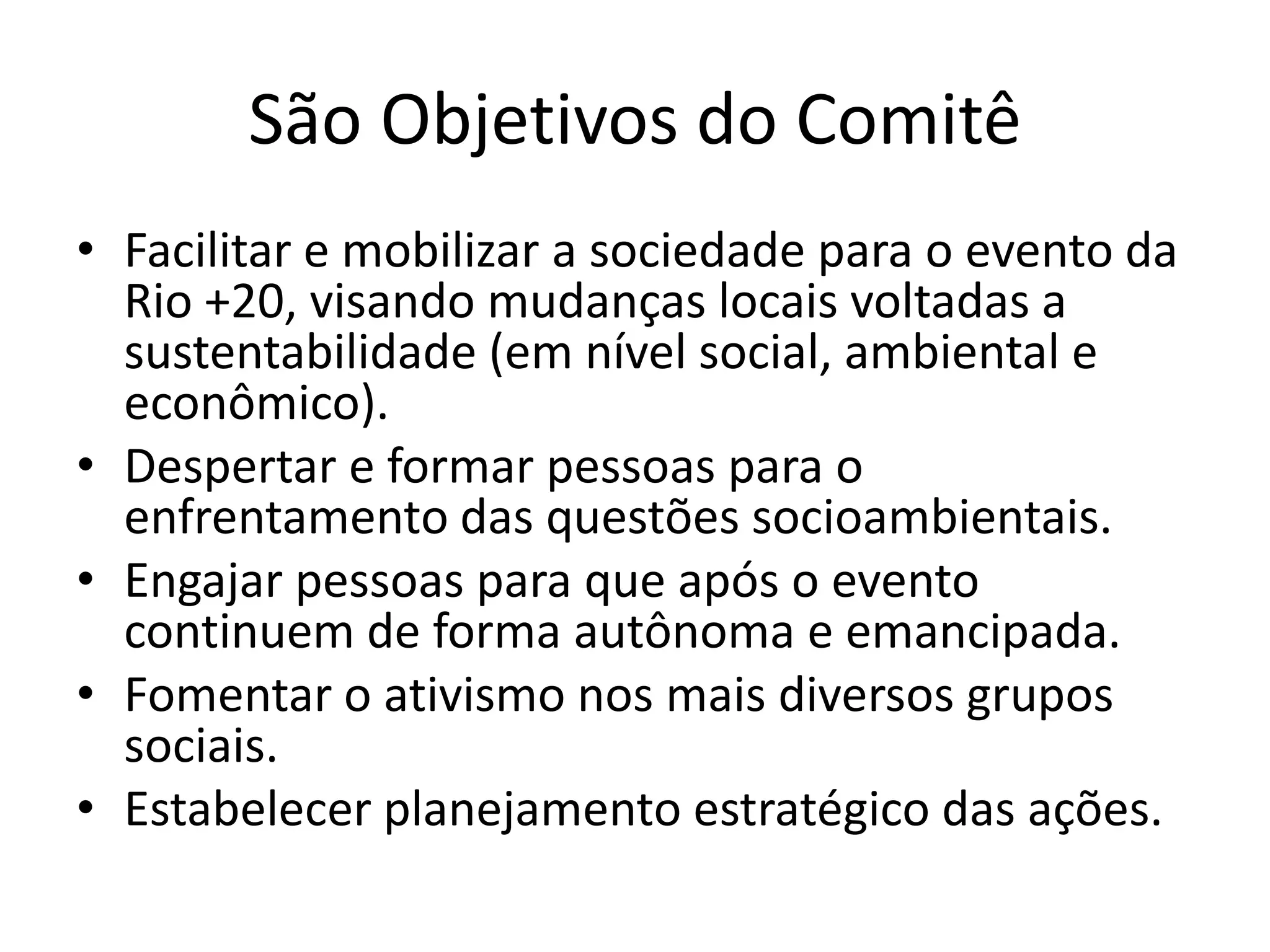 O documento descreve os objetivos e documentos norteadores de um comitê para mobilizar a sociedade para a conferência Rio+20, despertar pessoas para questões socioambientais e engajá-las para continuar trabalhando pela sustentabilidade após o evento. O comitê é apartidário e aberto para participação da sociedade civil interessada em causas socioambientais, com o objetivo de influenciar políticas públicas estaduais e globais.