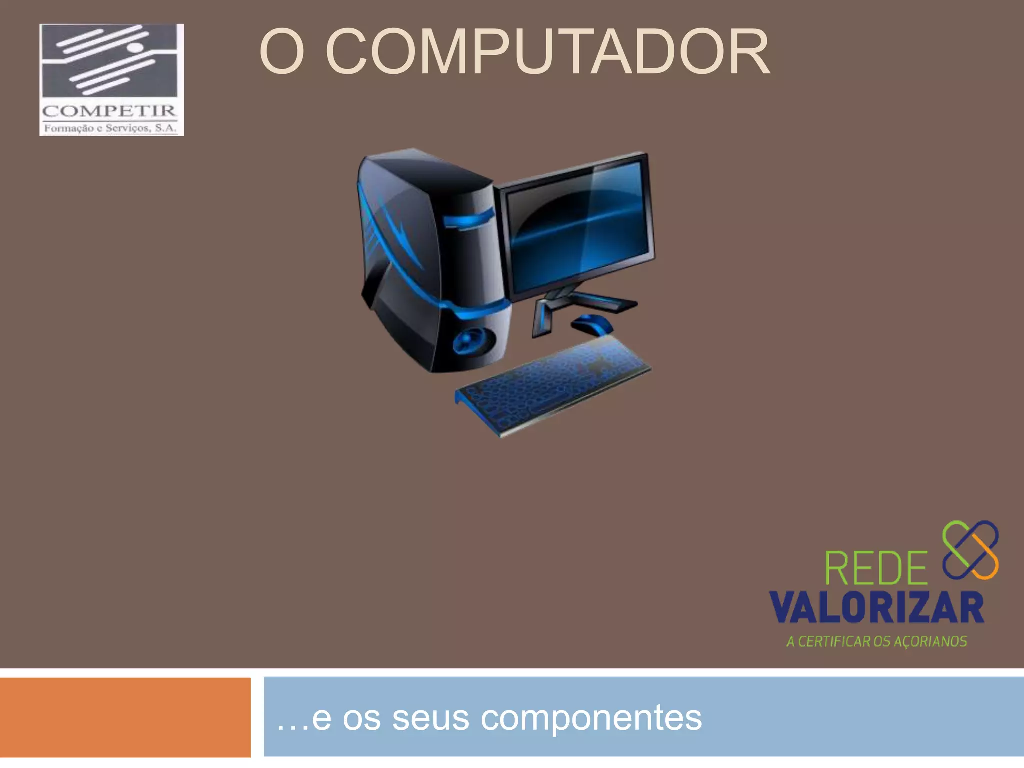 Este documento lista e descreve brevemente os principais componentes de um computador pessoal, incluindo o monitor, teclado, rato, componentes internos como placa-mãe e processador, e periféricos como impressora, webcam e alto-falantes.