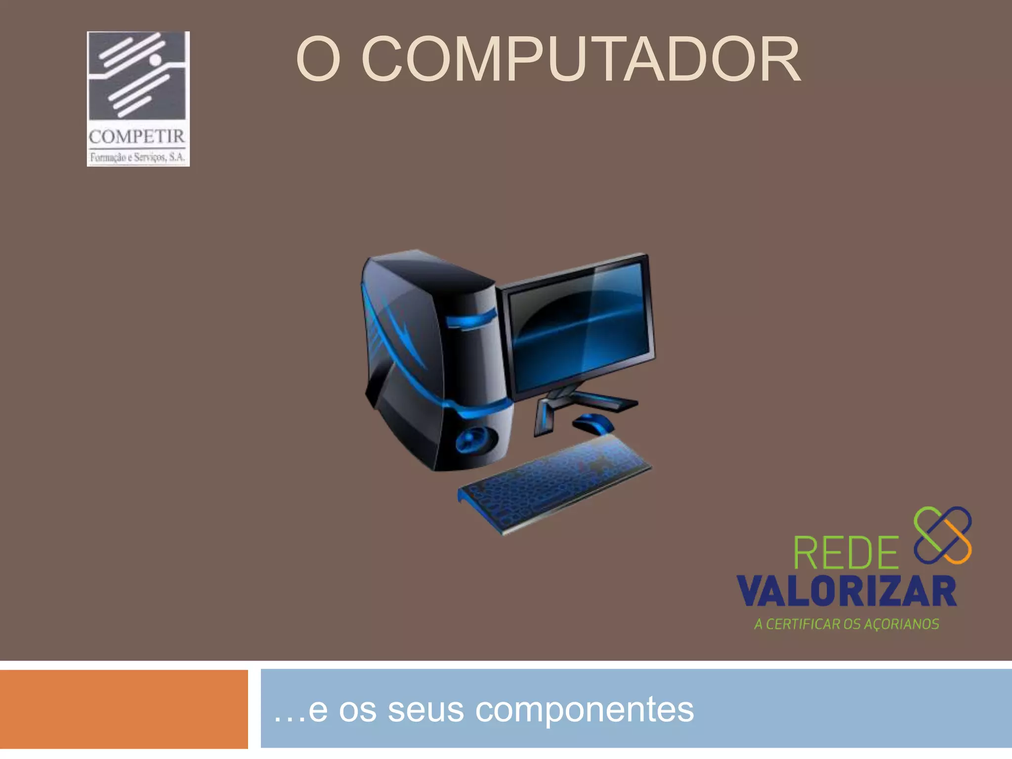 O documento lista e descreve os principais componentes de um computador pessoal, incluindo o monitor, rato, teclado e impressora, bem como outros itens internos como a placa-mãe e unidades de armazenamento.