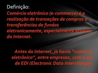 O documento discute o comércio eletrônico, definindo-o como a realização de transações de compras e pagamentos online, especialmente pela internet. Detalha os diferentes tipos de comércio eletrônico como B2B, B2C e C2C e discute o crescimento deste mercado no Brasil.