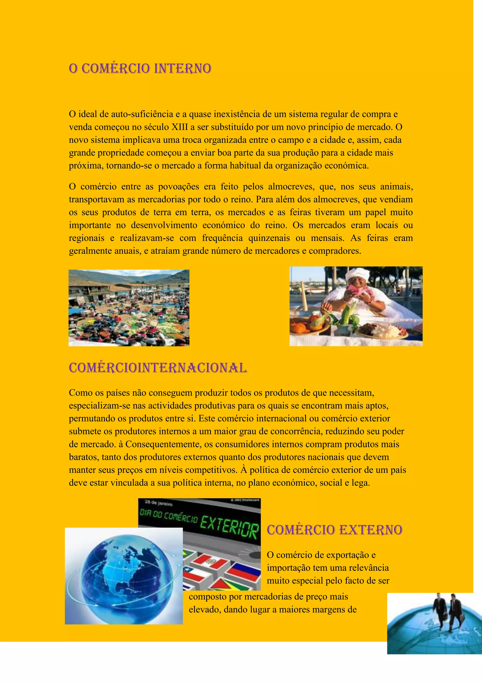 O documento descreve a evolução do comércio interno em Portugal entre os séculos XIII e XV, passando de um sistema de auto-suficiência para um mercado organizado entre as zonas rurais e urbanas. Os almocreves e as feiras e mercados locais e regionais desempenharam um papel importante no desenvolvimento do comércio interno.