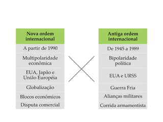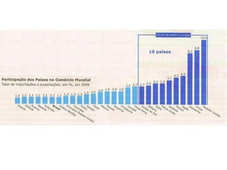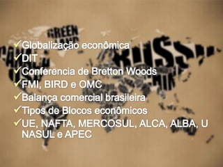 O documento discute a globalização econômica e o comércio multilateral. Apresenta como a expansão do capitalismo levou à integração dos mercados globais através da redução de barreiras comerciais e da formação de blocos econômicos regionais. Também explica como instituições como o FMI, Banco Mundial e OMC regulam e promovem o livre comércio internacional.
