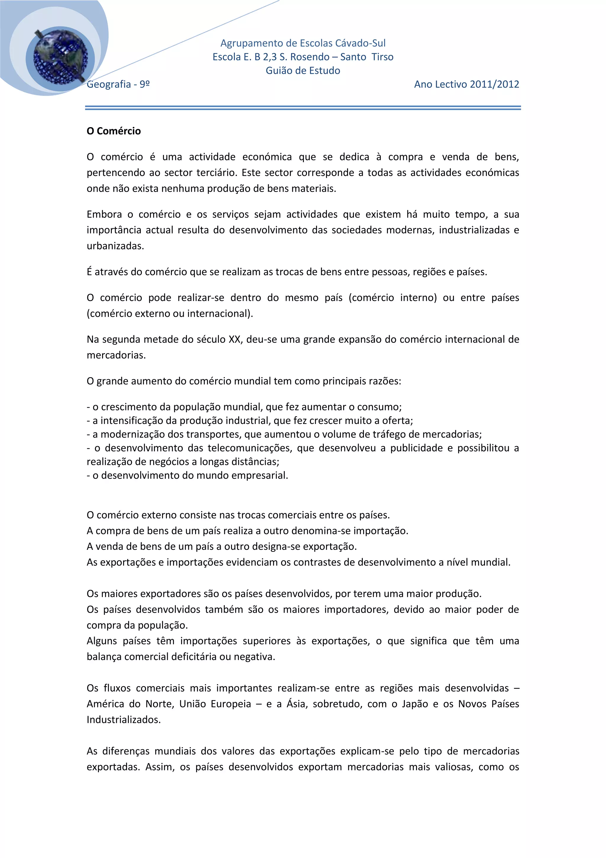 Este documento discute o comércio e os serviços. Resume que o comércio envolve a compra e venda de bens entre pessoas, regiões e países e que o comércio internacional cresceu significativamente no século XX devido ao crescimento populacional, produção industrial, transporte e comunicações. Também discute que os serviços são uma parte importante da economia, especialmente em países desenvolvidos.