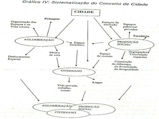 O documento discute o conceito de cidade e como ensiná-lo de forma interdisciplinar e significativa para os alunos. Aborda a definição de cidade como um arranjo espacial que reflete modos de vida e produção, e como um território com diferentes percepções culturais. Também enfatiza a importância de partir da experiência imediata dos alunos e aplicar conceitos à sua realidade, em vez de apenas memorizá-los.