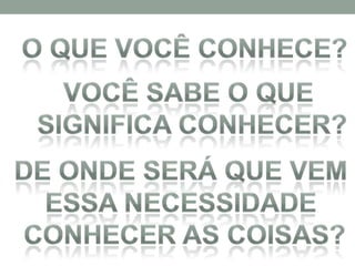 O documento discute os diferentes tipos de conhecimento, incluindo senso comum, mítico, religioso, científico e filosófico. Define cada um e fornece exemplos. Explica também como o conhecimento é adquirido através da sensação, observação, imaginação, linguagem, raciocínio, intuição e testes.