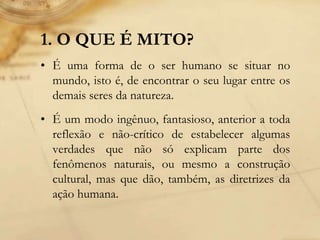 O documento discute o conceito de mito, definindo-o como uma forma primitiva de explicar o mundo que dá significado à existência humana e diretrizes para a ação. Explica que os mitos surgiram para afastar medo e insegurança e eram representados em rituais. Também discute como os meios de comunicação modernos fabricam novos mitos e como estes organizam um mundo superficial sem contradições.