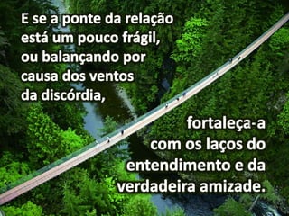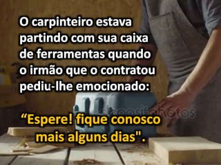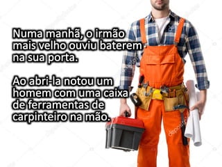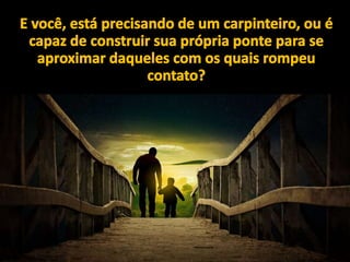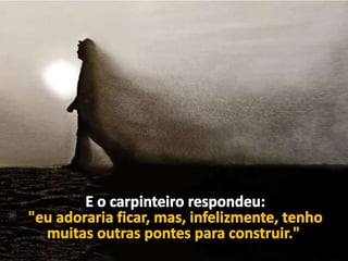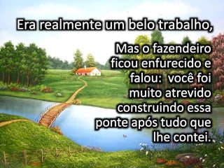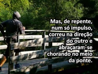Dois irmãos que moravam em fazendas vizinhas entraram em conflito sobre um riacho que separava suas propriedades, causando a primeira grande desavença em suas vidas de trabalho conjunto. A mensagem prega a construção de pontes para superar desavenças e se aproximar daqueles que estão distantes.