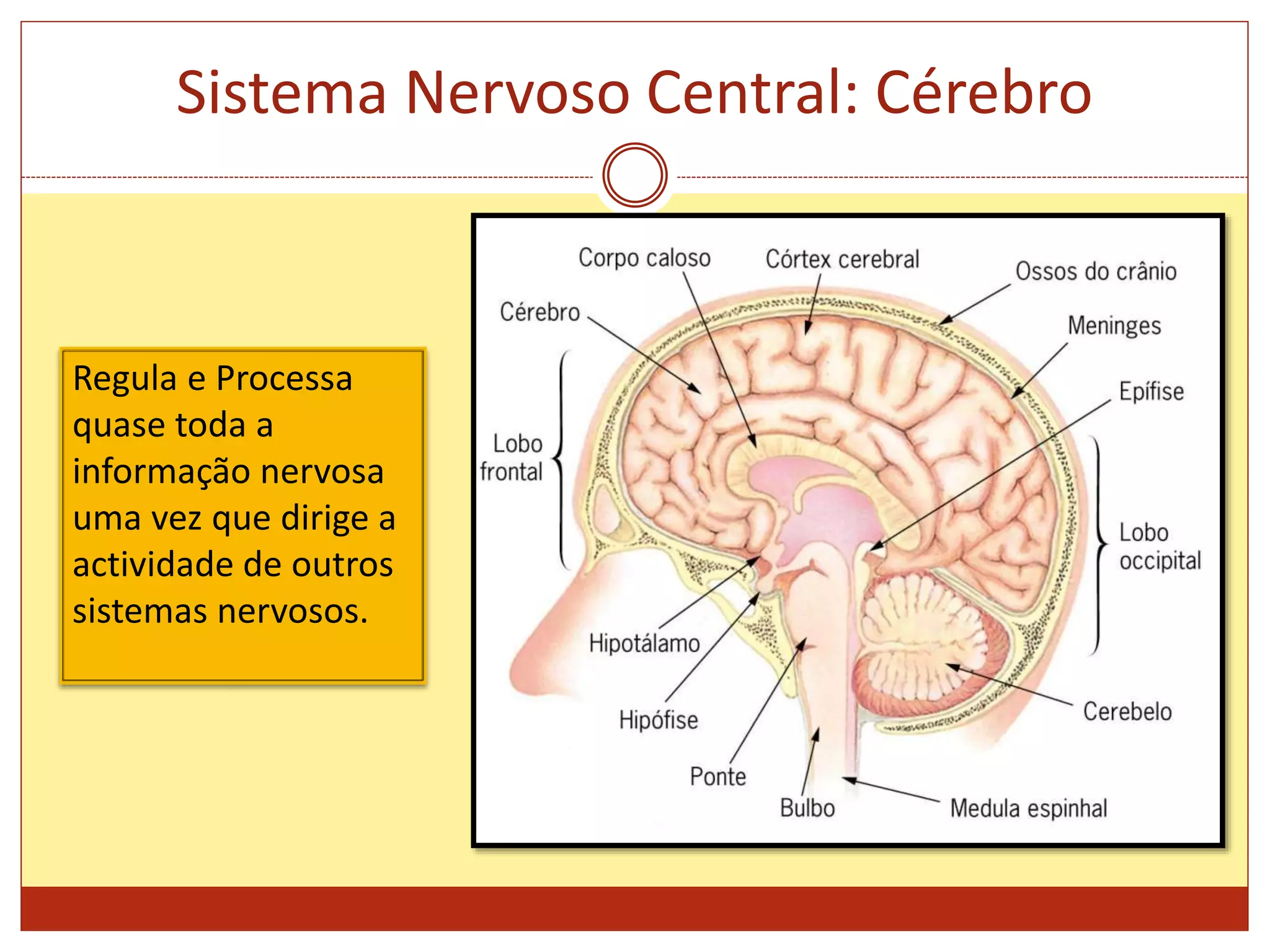 O documento descreve as principais estruturas do cérebro e suas funções. O cérebro é dividido em dois hemisférios e quatro lobos - occipital, temporal, parietal e frontal - cada um responsável pelo processamento de diferentes tipos de informação sensorial e motora. Lesões nessas áreas podem causar condições como cegueira, surdez e distúrbios na fala ou movimento.