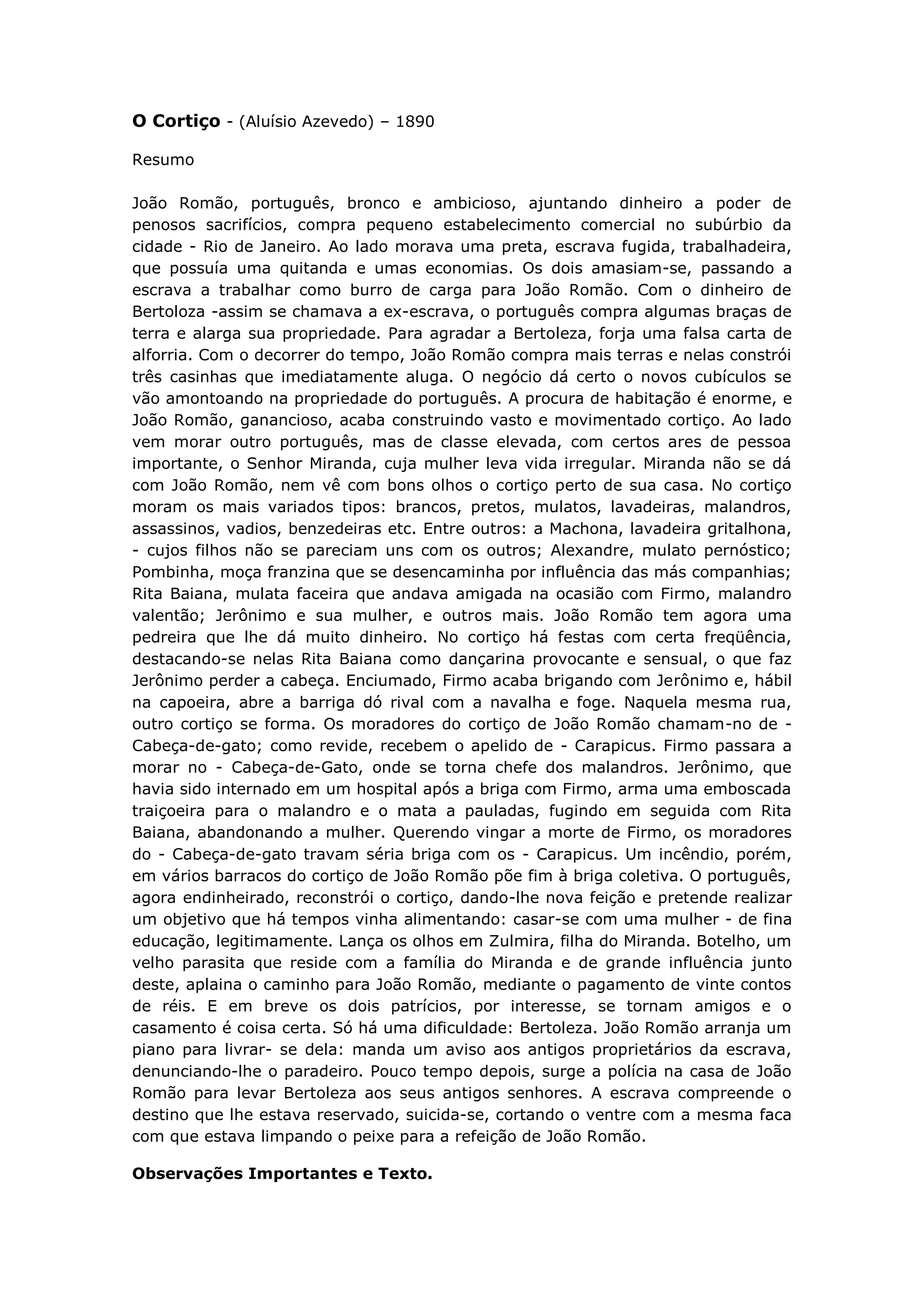 João Romão, um português ambicioso, constrói um cortiço (favela) no Rio de Janeiro para lucrar com o aluguel de casas. O cortiço atrae uma variedade de pessoas pobres e marginalizadas e se torna um local de festas e brigas. João Romão fica rico e planeja se casar com a filha de um vizinho rico, enquanto explora e abandona sua amante escrava Bertoleza.