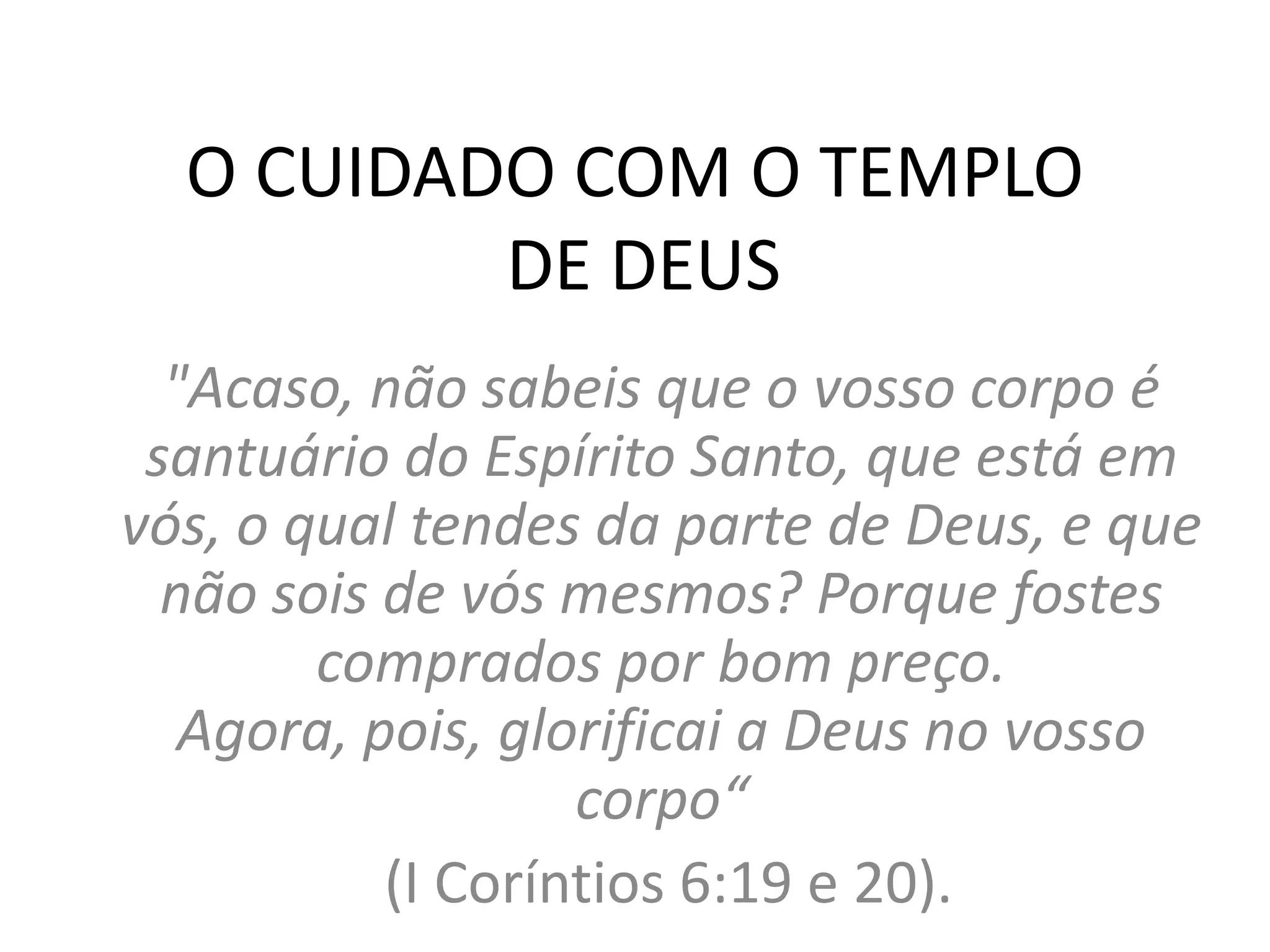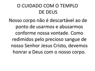O documento destaca a importância de cuidar do corpo como um templo do Espírito Santo, enfatizando que devemos honrar a Deus através de nosso corpo. Fornece orientações práticas para uma vida saudável, incluindo dicas sobre alimentação equilibrada e exercício físico. A mensagem central é que o cuidado com o corpo está ligado à espiritualidade e ao bem-estar físico.