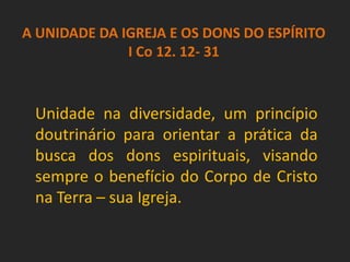 1) O documento discute a unidade da Igreja e a diversidade de dons do Espírito Santo, citando I Coríntios 12.