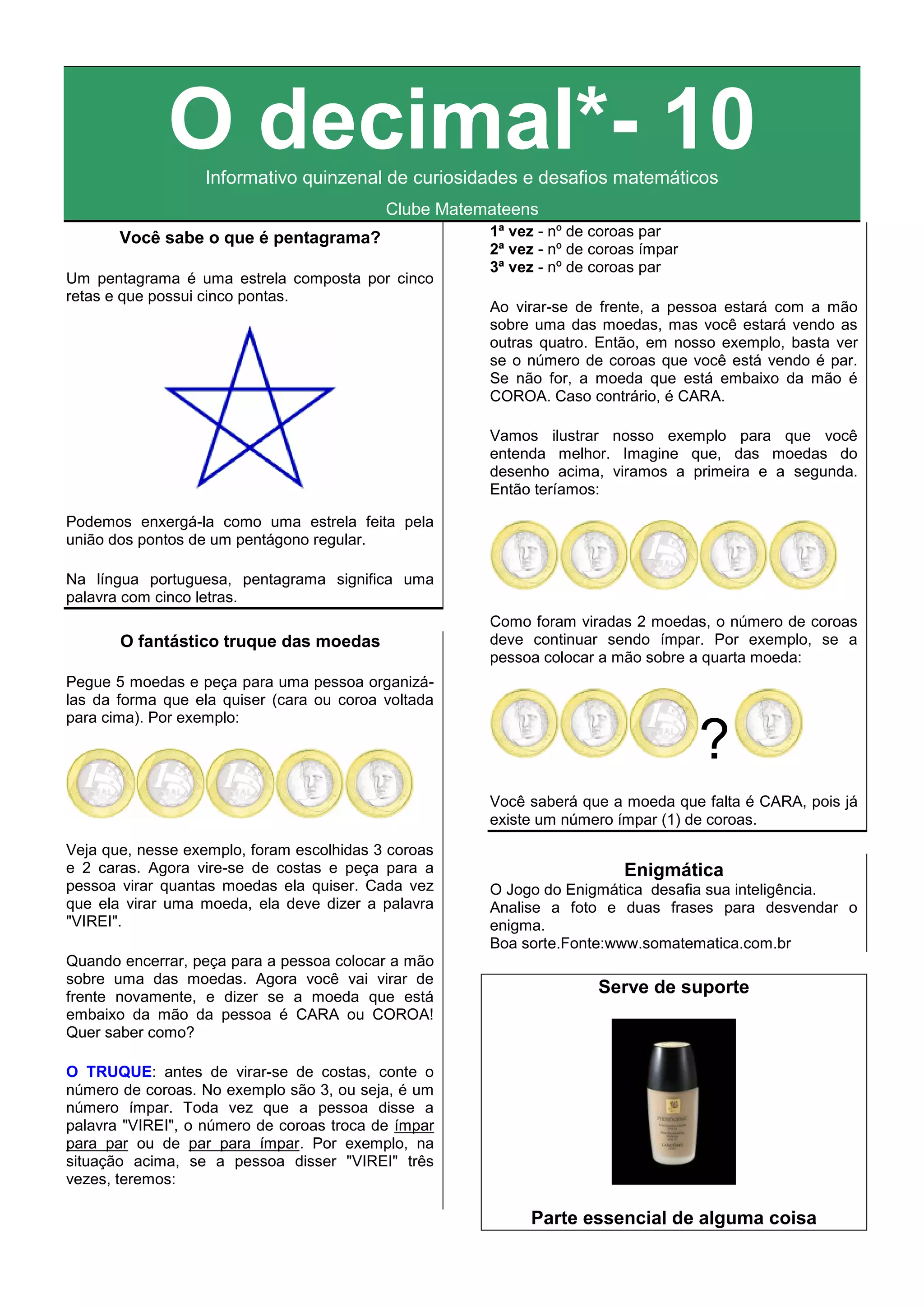 O documento explica o que é um pentagrama, que é uma estrela de cinco pontas formada por um pentágono regular, e também fala sobre um truque com moedas onde se conta o número de coroas iniciais para adivinhar se a moeda escolhida é cara ou coroa.