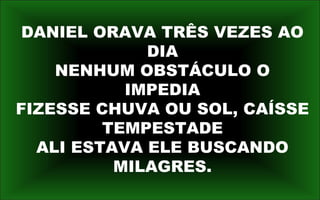 O documento fala sobre um decreto do rei que proibiu orações. Daniel continuou orando mesmo sendo lançado na cova dos leões. O autor também promete continuar orando a Deus, mesmo que haja decretos o proibindo.