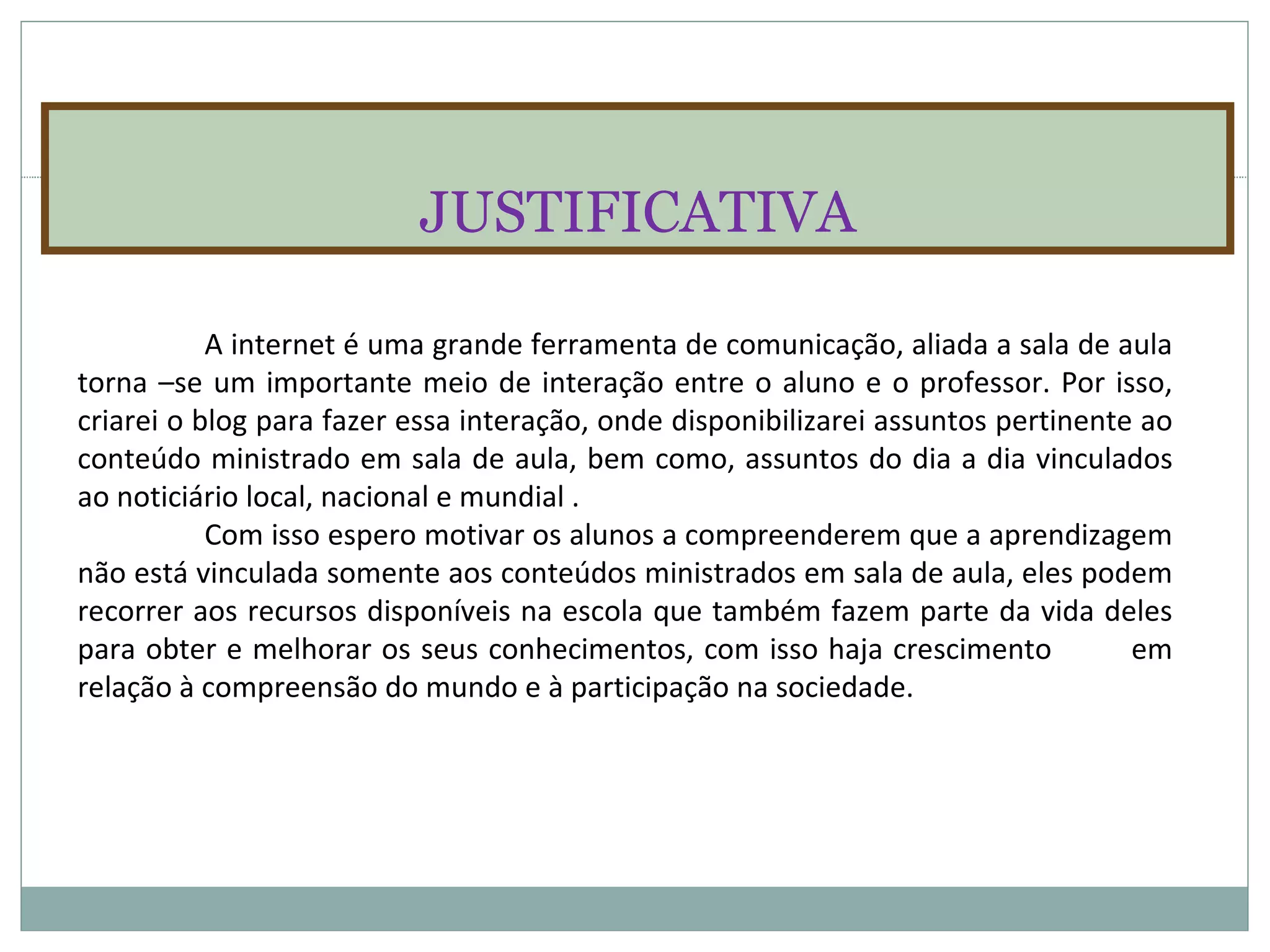 O documento discute o uso de blogs como ferramenta pedagógica para melhorar a interação entre alunos e professores e motivar os alunos a aprender não apenas os conteúdos em sala de aula, mas também assuntos do mundo real. O blog será usado para postar materiais complementares e atividades que estimulem a leitura reflexiva e a participação dos alunos no processo de ensino-aprendizagem.