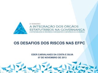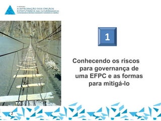 O documento discute os desafios dos riscos nas entidades fechadas de previdência complementar (EFPC). Em 3 frases: Trata dos principais riscos operacionais nas EFPC, como erros nos processos de concessão de benefícios. Também aborda formas de mitigar riscos em EFPC com pouca estrutura, como ter uma diretoria profissional dedicada exclusivamente à fundação. Por fim, destaca a importância de aprender com erros passados para melhorar processos e segurança dos participantes.