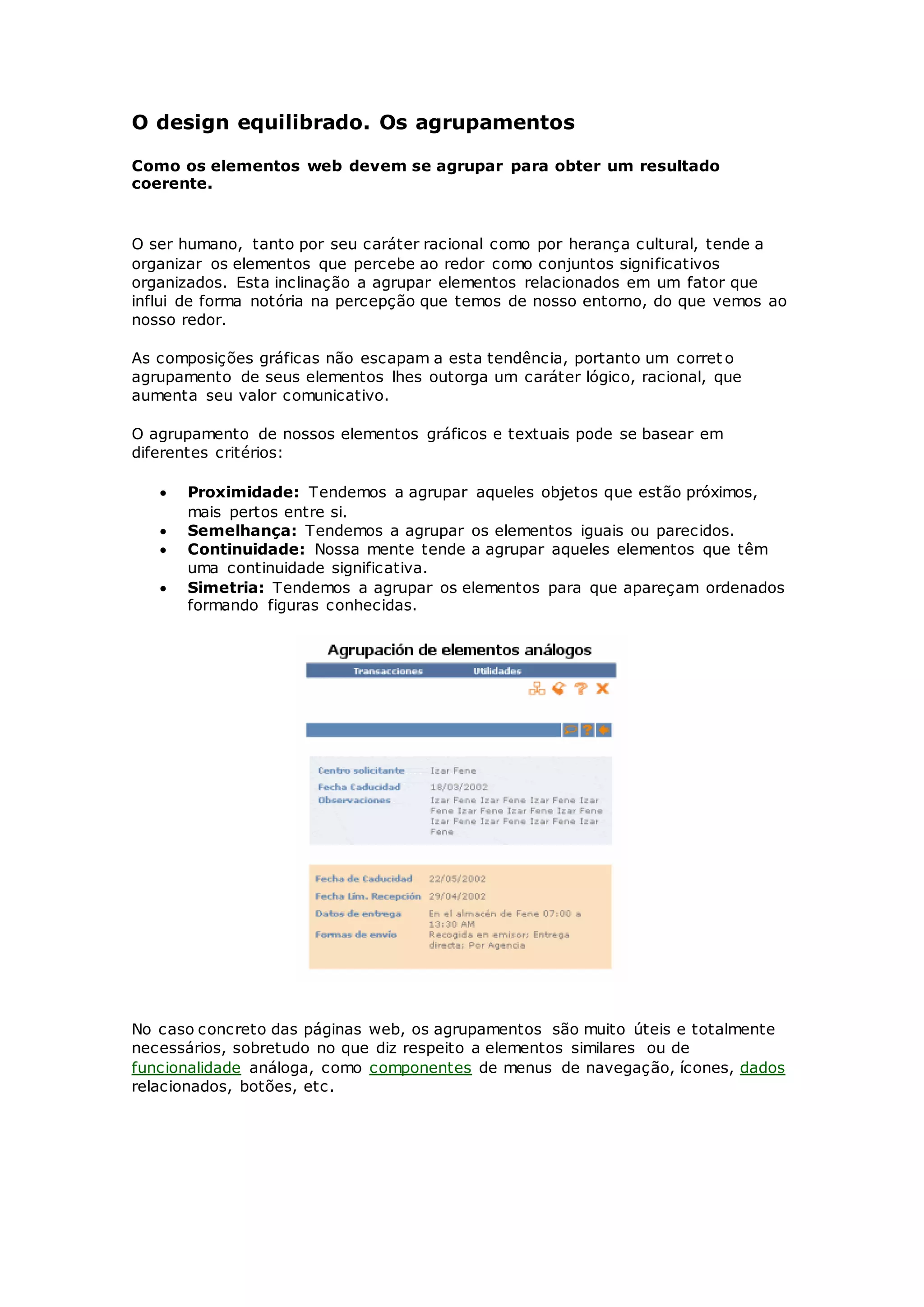 O documento discute como elementos web devem ser agrupados de forma coerente. Explica que os seres humanos tendem a organizar elementos em conjuntos significativos baseados em critérios como proximidade, semelhança, continuidade e simetria. Nos sites, agrupamentos de elementos como menus, ícones e botões tornam a navegação mais lógica. Formulários também se beneficiam de agrupamentos por tipo de informação.