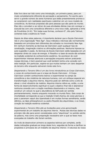 Este documento descreve um processo para desenvolver a visão espiritual através do terceiro olho. Ele introduz princípios como não forçar a percepção, confiar na experiência e não analisar durante uma experiência. O objetivo é revelar o potencial interior do leitor e permitir que experiências espirituais surjam de forma espontânea através da prática de técnicas simples.