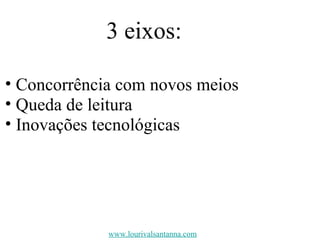 O documento discute os desafios enfrentados pelos jornais impressos com o avanço das novas tecnologias e queda na leitura. Apresenta dados sobre o declínio no tempo dedicado à leitura de jornais e circulação impressa. Também analisa pesquisas sobre a percepção do público em relação à credibilidade de diferentes meios de comunicação e como fonte de informação.