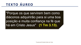 O documento descreve o perfil e função do diácono de acordo com a Bíblia. Apresenta a diaconia de Jesus como modelo de serviço, a instituição do diaconato na Igreja primitiva devido a uma crise étnica e as qualificações atuais de caráter moral, espiritual e familiar para o cargo.