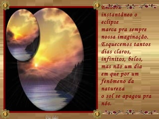 O documento faz uma comparação entre eclipses solares e momentos de tristeza na vida. Ele afirma que assim como eclipses são rápidos e temporários, períodos de tristeza também passam, embora deixem marcas emocionais. Apesar de valorizarmos demais os momentos de tristeza, na verdade as alegrias são mais comuns em nossas vidas. A tristeza é transitória e logo vai passar, assim como um eclipse.