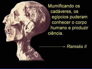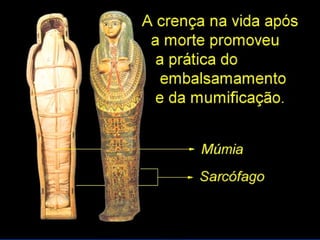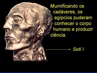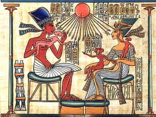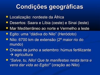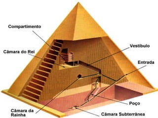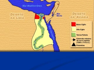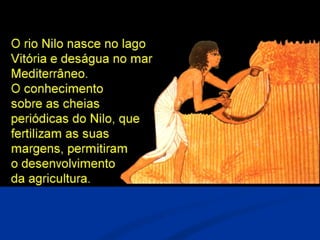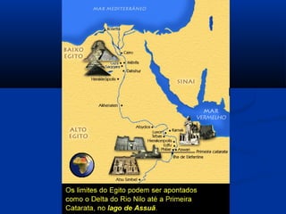 O documento descreve a história do Antigo Egito, desde as primeiras comunidades sedentárias às margens do Nilo até a conquista pelos persas. Destaca-se a unificação do Egito por Menés em 3200 a.C., a construção de grandes pirâmides como as de Gizé, o apogeu militar e cultural do Novo Império e a queda da independência egípcia após a invasão persa em 525 a.C.