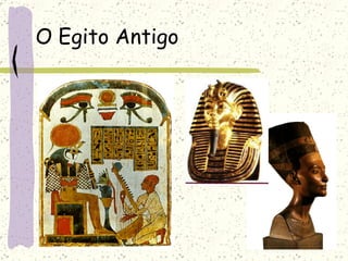 O documento fornece um resumo da localização, clima, solo e economia do antigo Egito, com foco no papel central do rio Nilo. Explica a estrutura da sociedade egípcia antiga, dominada pelo faraó, e os principais aspectos da cultura egípcia, como a escrita, religião, arte, arquitetura e a prática da mumificação.