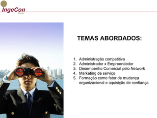 O documento discute as mudanças na era da globalização e como as empresas precisam se adaptar, com foco na competitividade, conhecimento e relacionamentos. Aborda a importância da administração competitiva, do empreendedorismo e da formação contínua para garantir a confiança e os resultados das empresas.
