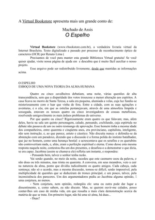 O documento apresenta um resumo de um conto de Machado de Assis chamado "O Espelho". Um homem chamado Jacobina explica sua teoria de que cada pessoa tem duas almas: uma voltada para dentro e outra para fora. Ele ilustra isso contando sobre quando era mais jovem e sua alma exterior era seu cargo militar, levando-o a se transformar.