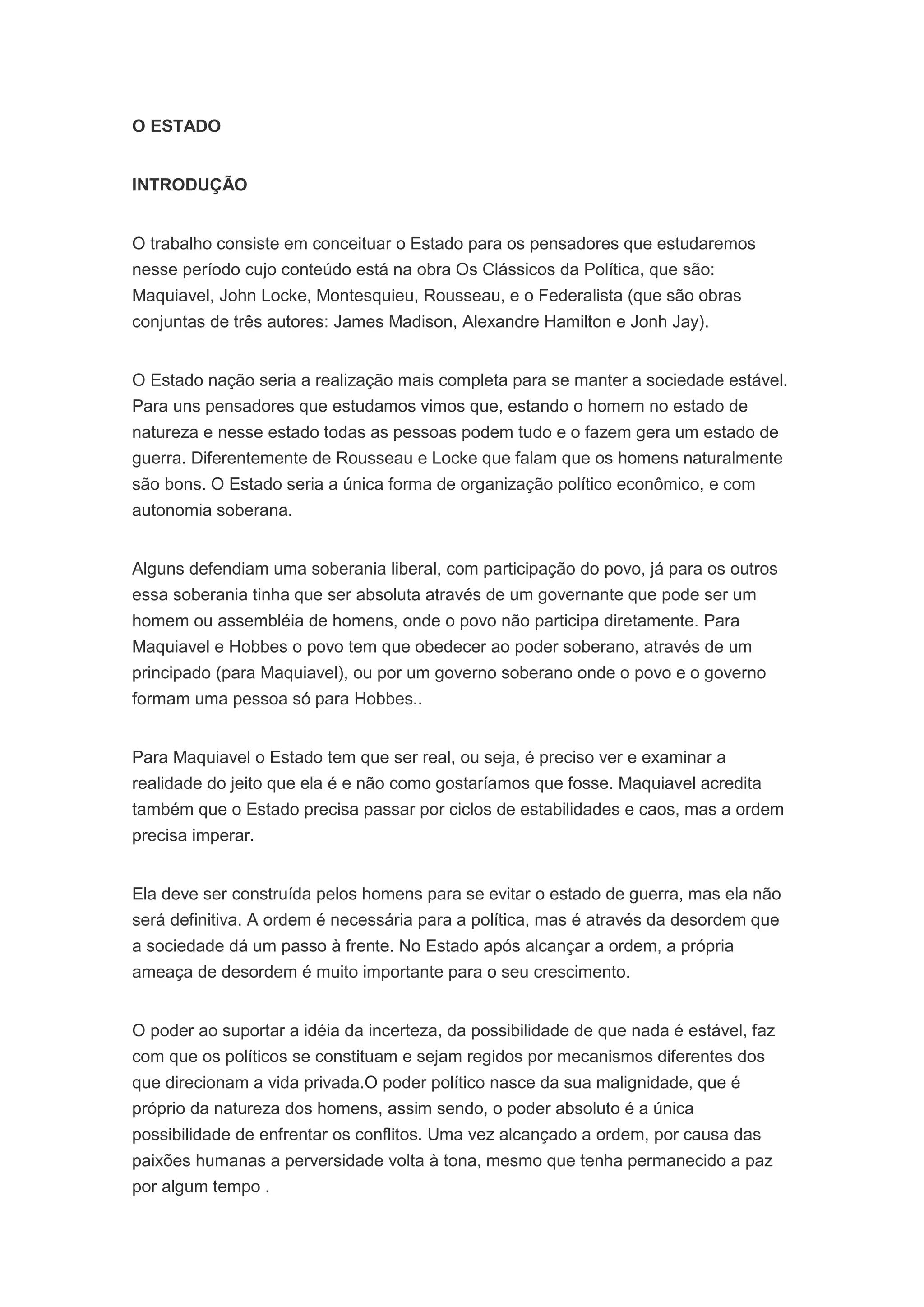 1) O documento conceitua o Estado para pensadores clássicos como Maquiavel, Locke, Montesquieu, Rousseau e os Federalistas. 2) Para Maquiavel, o Estado é necessário para manter a ordem e evitar o estado de guerra, sendo o Príncipe essencial para isso. 3) Para Hobbes, o Estado surge de um contrato social onde os indivíduos transferem seus direitos a uma autoridade soberana central para garantir segurança.