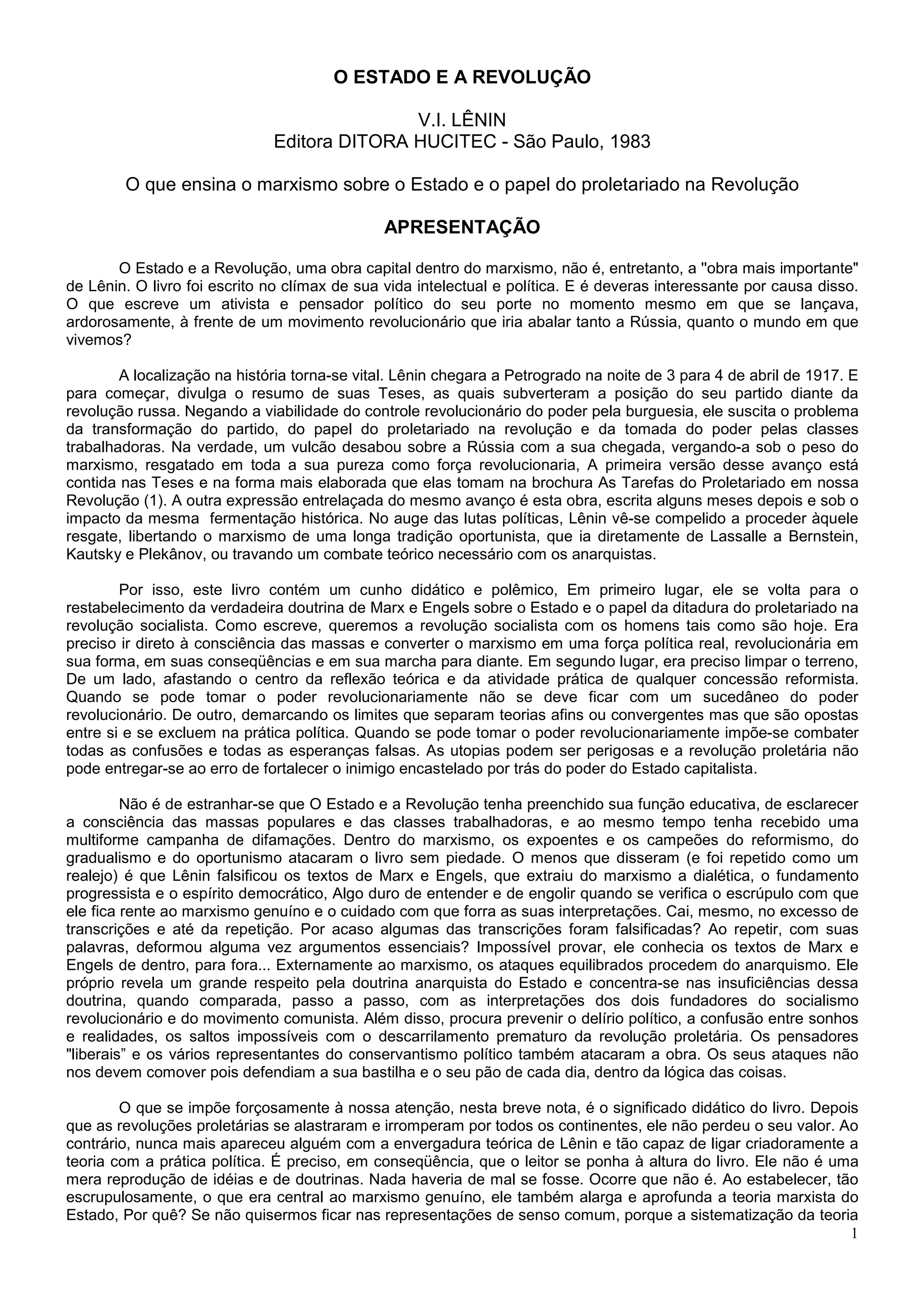 1) O documento apresenta a obra "O Estado e a Revolução" de Lênin, escrita em 1917 para esclarecer a teoria marxista do Estado e do papel do proletariado na revolução.