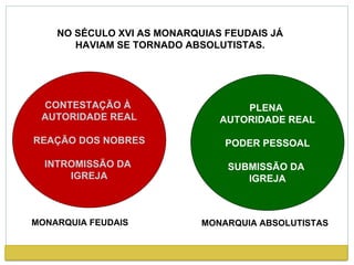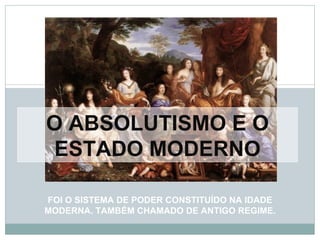 O documento descreve o sistema de poder absolutista que emergiu na Idade Moderna na Europa. O absolutismo consolidou-se nos séculos XVI e XVII através da centralização do poder real e da submissão da nobreza e da igreja. Autores como Maquiavel, Bodin e Hobbes defenderam teoricamente o poder absoluto dos monarcas. A França de Luís XIV foi o maior exemplo deste sistema no século XVII.
