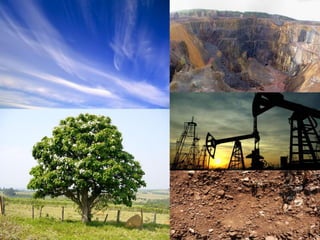 O documento discute os conceitos de extrativismo e suas formas. Apresenta os tipos de extrativismo (mineral, animal e vegetal) e explica a coleta, atividade econômica complementar e escala industrial. Também aborda o extrativismo mineral, com exemplos de garimpagem e indústria, além de falar sobre a distribuição desigual de recursos minerais e a interdependência entre países.