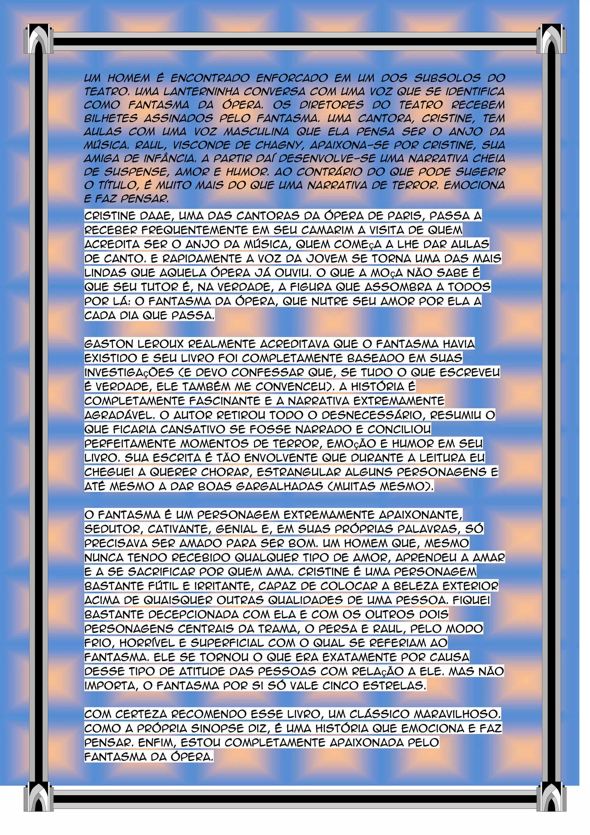 Um homem é encontrado morto no teatro da Ópera de Paris. O Fantasma da Ópera ameaça os diretores e começa a dar aulas de canto particulares para a cantora Cristine, por quem se apaixona. Cristine também é amada por Raul. A história explora os triângulos amorosos envolvendo esses personagens contra o pano de fundo das ameaças do Fantasma ao teatro.